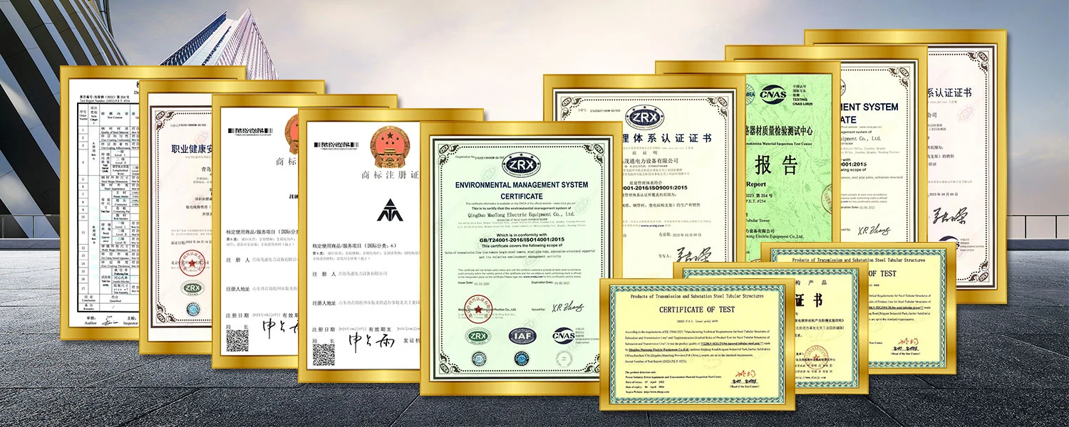 La société possède une technologie de production et de traitement mature et un système d'assurance qualité parfait, avec une licence de production de tour de ligne de transmission de 220kV》, 《Licence nationale de production de produits industriels》, 《Certificat de qualité de tuyau en acier de 220kV》 et 《500kV de la qualité de la tour de tuyaux en acier》 Émis par l'administration générale de la qualité de qualité de qualité de qualité, d'inspection.